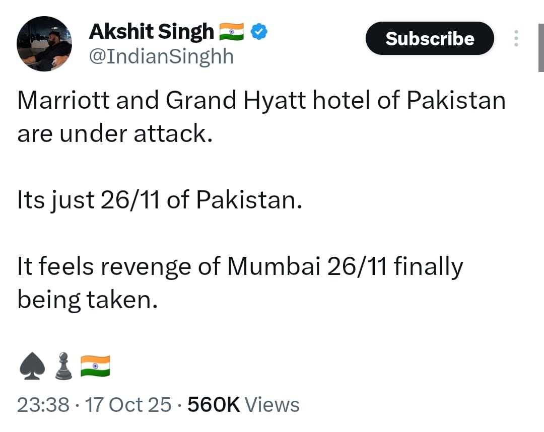An Indian social user shared a post with the caption, “Marriott and Grand Hyatt hotel of Pakistan are under attack,” equating the incident to Mumbai attack.