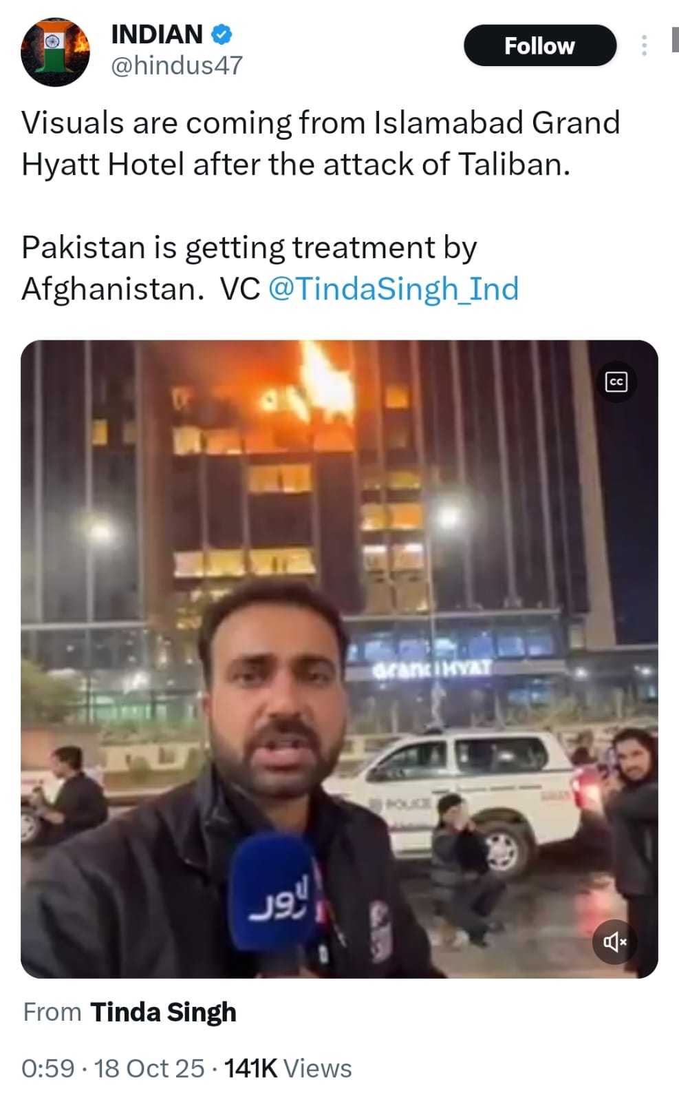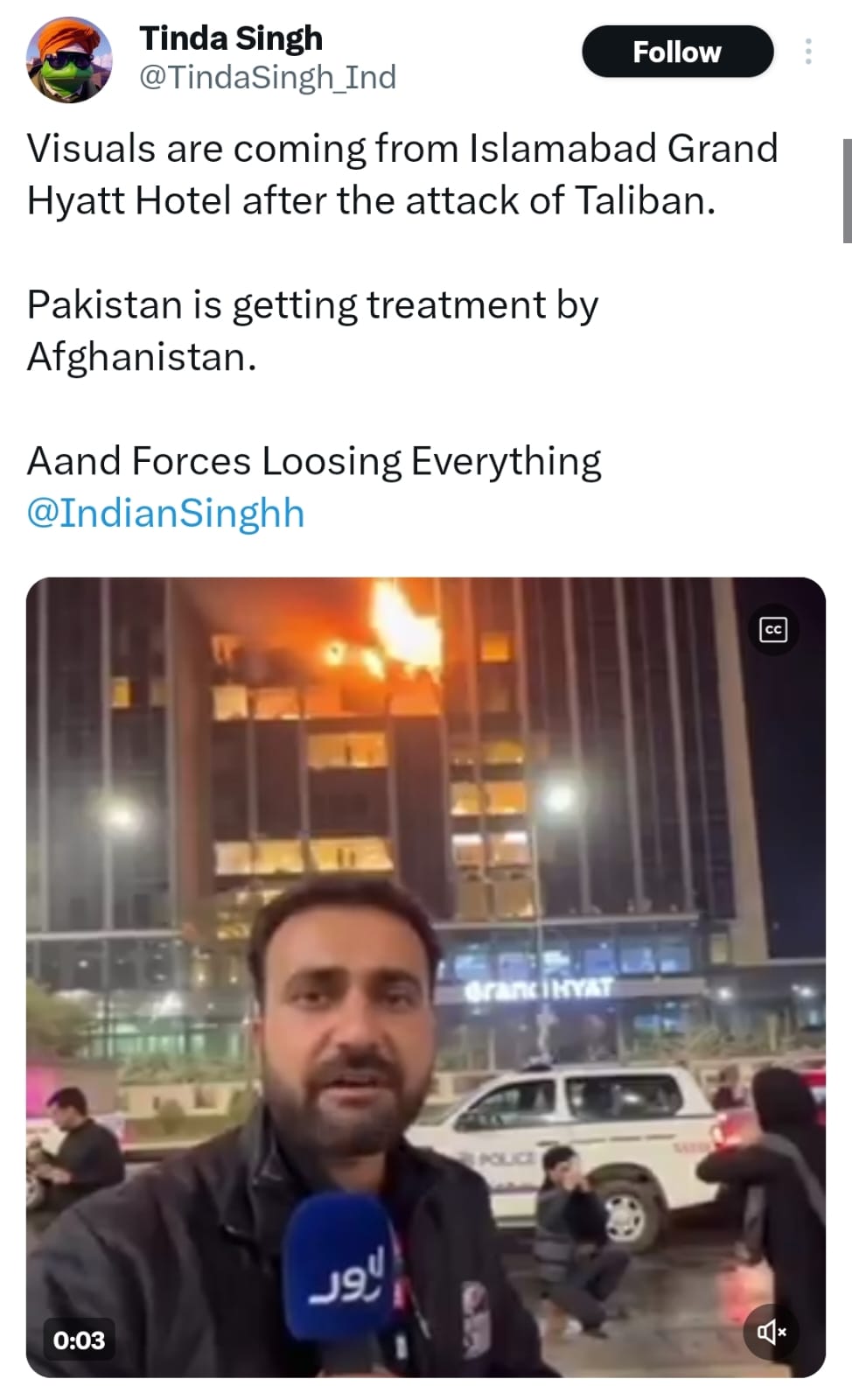 A social media user posted, saying, “Visuals are coming from Islamabad Grand Hyatt hotel after the attack of Taliban.”