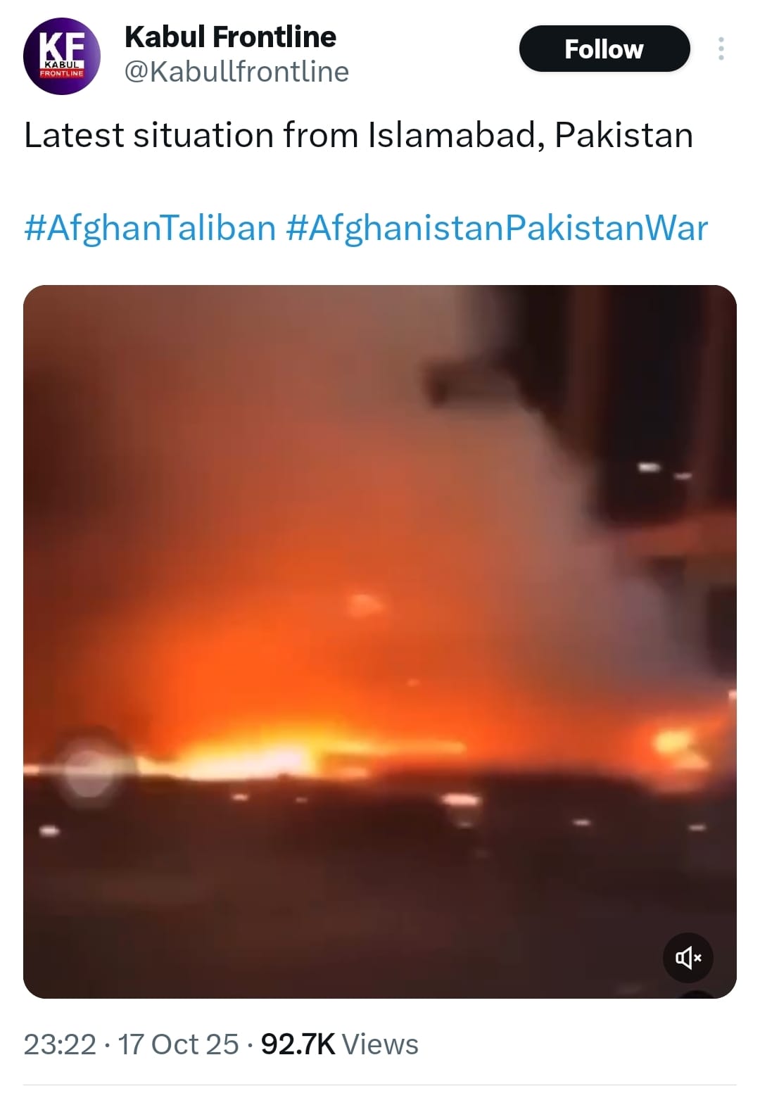 An Afghanistan based digital outlet, Kabul Frontline, shared a video on October 17 with a brief caption, “Latest Situation in Islamabad” with the hashtag #PakistanAfghanistanWar.  The video shows a huge explosion at an undisclosed location.