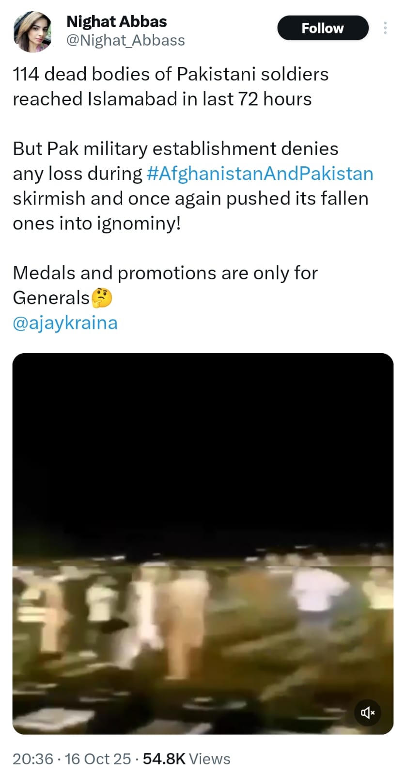 A social media user shared a post captioned, “114 bodies of Pakistani soldiers reached Islamabad in last 72 hours. But Pak establishment denies any loss during Afghanistan and Pakistan skirmish and once again pushed it fallen ones into ignominy.”