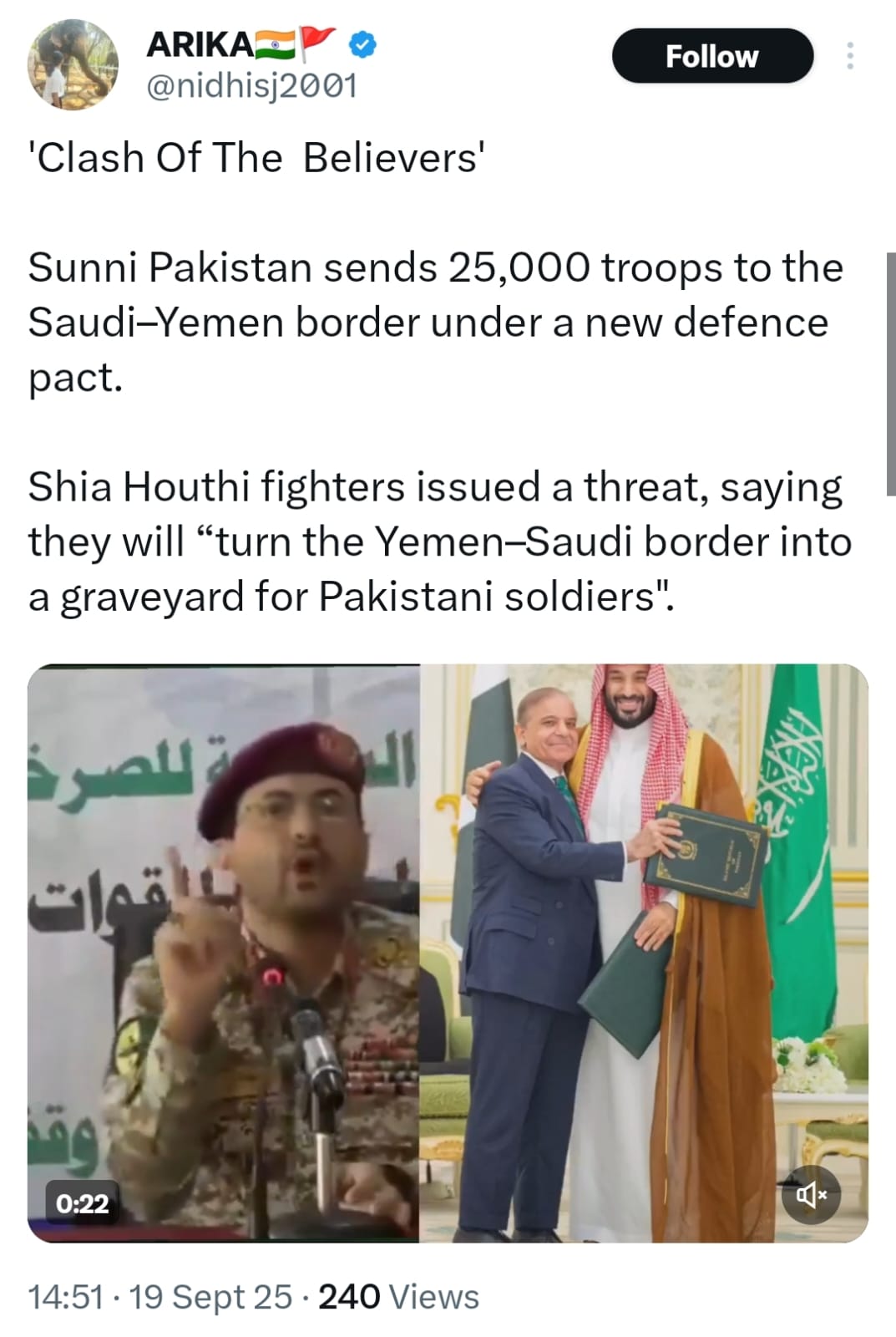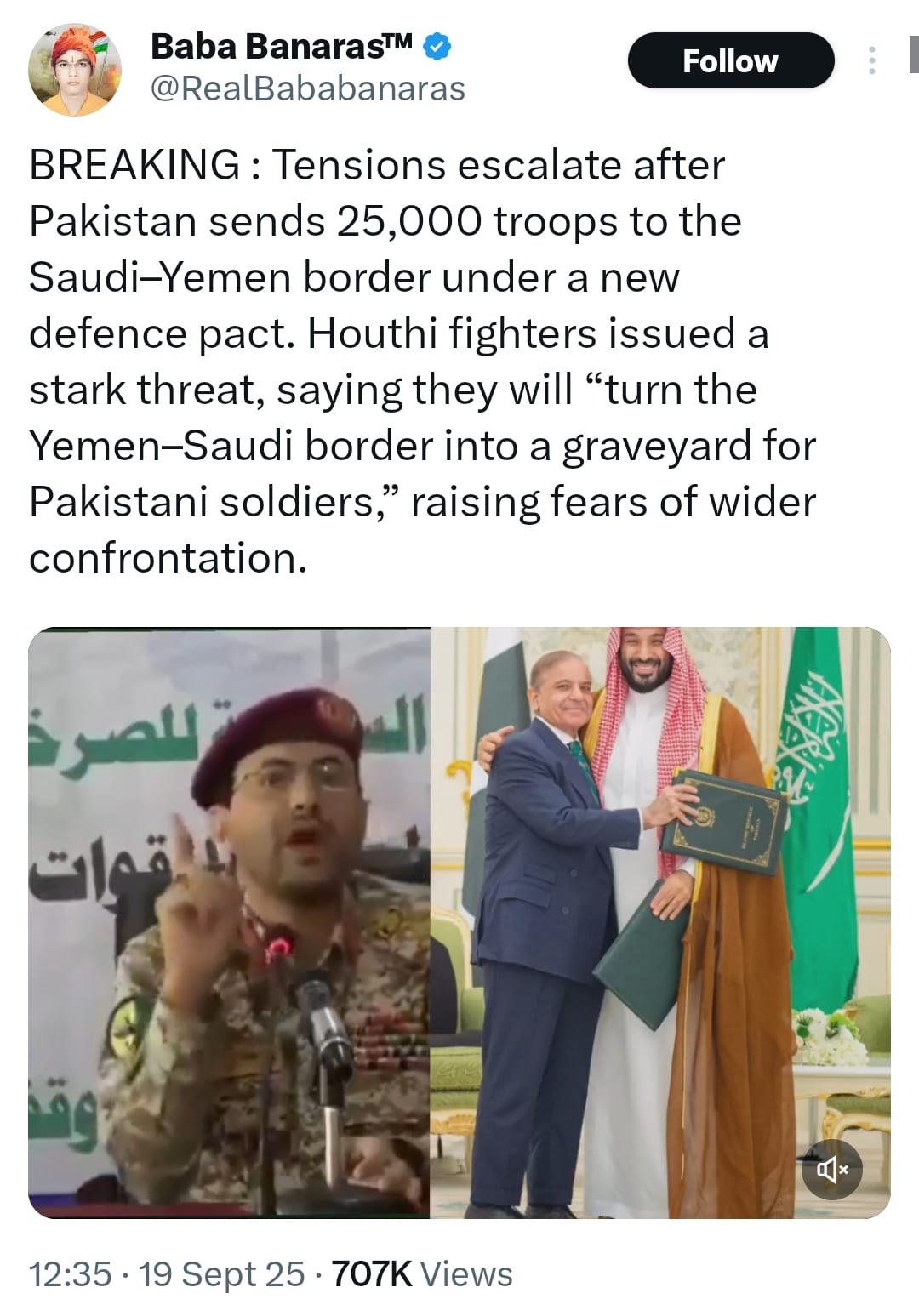 An Indian social media user, known for his negative posts against Pakistan, shared the post with the following caption: “Tensions escalate after Pakistan sends 2,000 troops to the Saudi Yemen border under a few defence pact. Houthi fighters issued a stark threat, saying they will “turn the Yemen Saudi border into a graveyard for Pakistani soldiers,” raising fears of wider confrontation.”