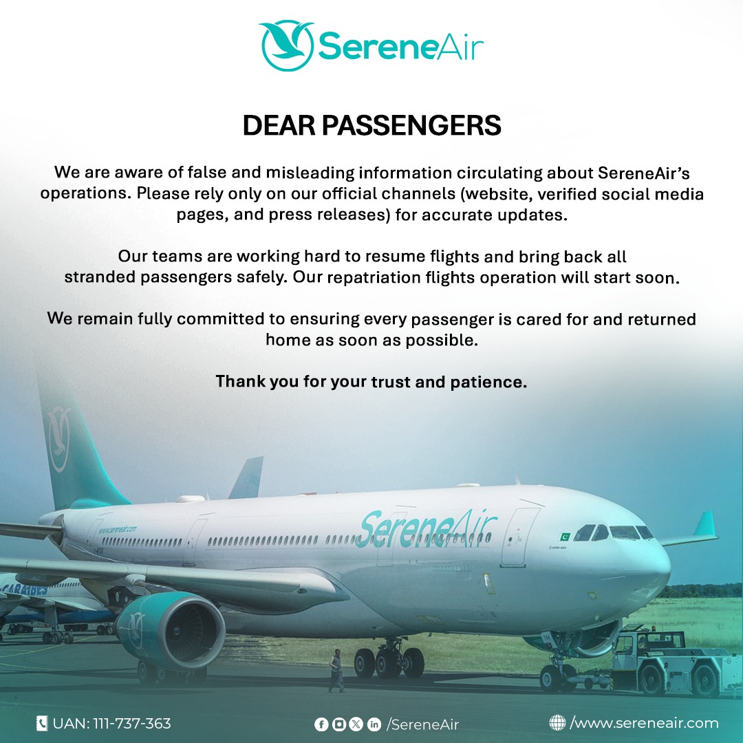 According to an official notification, Serene Air failed to meet the regulatory requirement of maintaining the minimum prescribed fleet size. At present, the airline has “zero serviceable aircraft available for operations,” making it unfit to sustain safe and reliable flights.