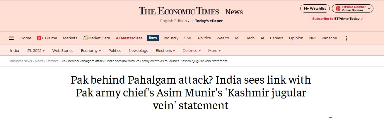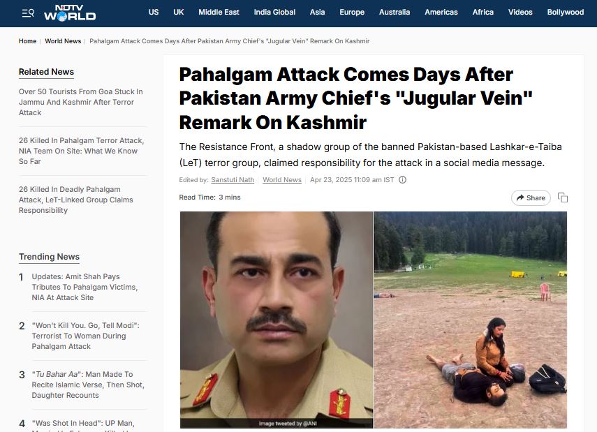 “The terrorist attack in J&K’s Pahalgam district came days after Pakistan Army chief Gen Asim Munir described Kashmir as Islamabad’s “jugular vein”,” the outlet wrote.