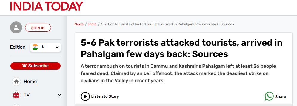 India Today also continued the hyper-sensationalist report with the news headline,”5-6 Pak terrorists attacked tourists, arrived in Pahalgam few days back: Sources.”