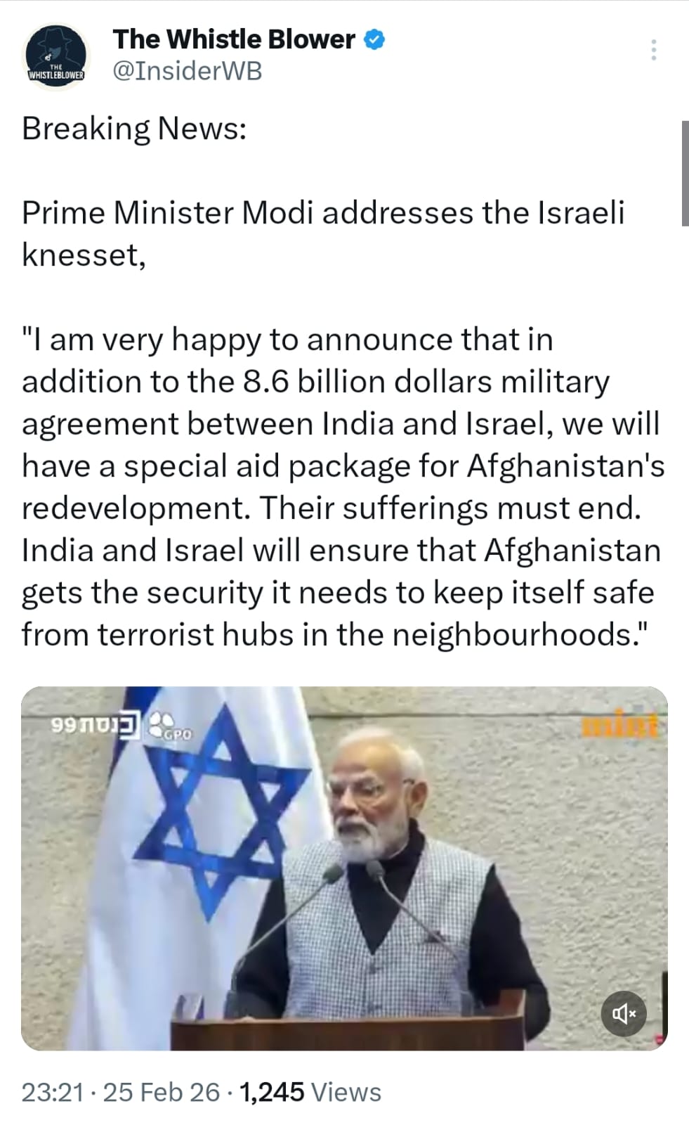 An X account, The Whistle Blower, that regularly spreads misinformation, posted the video on X, captioned, “Prime Minister Modi addresses the Israeli knesset,