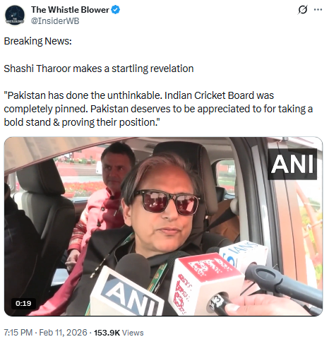 The original video was shared by Indian news outlet ANI on Feb 10 in which Tharoor refers to Pakistan’s decision to play against India in T20 World Cup
