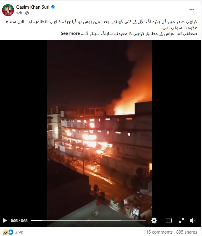 PTI leader Qasim Suri, who is based in the United States, posted a video on Facebook, claiming it relates to the Gul Plaza fire. The video show a building collapses after being engulfed by a massive fire.