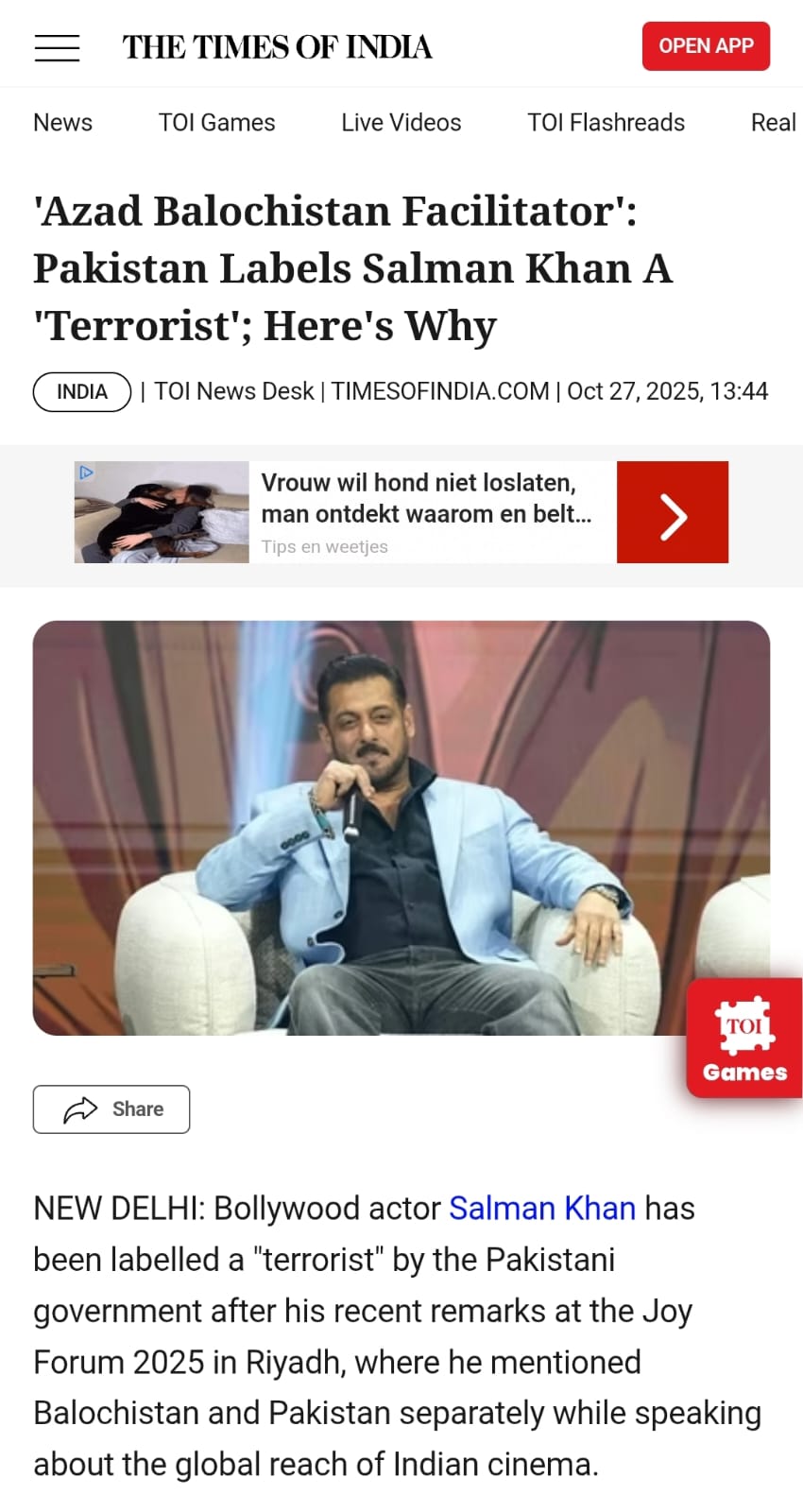 The claim comes after Salman Khan made the remarks referring to Balochistan as a seperate entity at the Joy Forum 2025 in Riyadh, where he appeared alongside actors Shah Rukh Khan and Amir Khan to discuss the influence of Indian cinema in the Middle East.