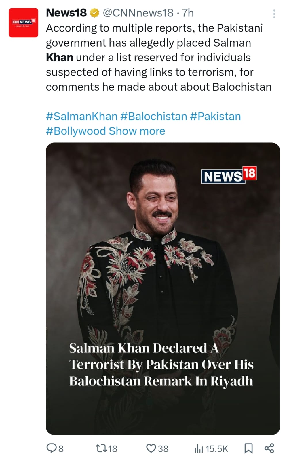 Well-known Indian media outlet, News18, shared a news report titled, “Salman Khan declared a terrorist by Pakistan over Balochistan remark in Riyadh.” The caption on X says, “According to multiple reports, the Pakistan government has allegedly placed Salman Khan under a list reserved for individuals suspected of having links to terrorism, for comments he made about Balochistan.”