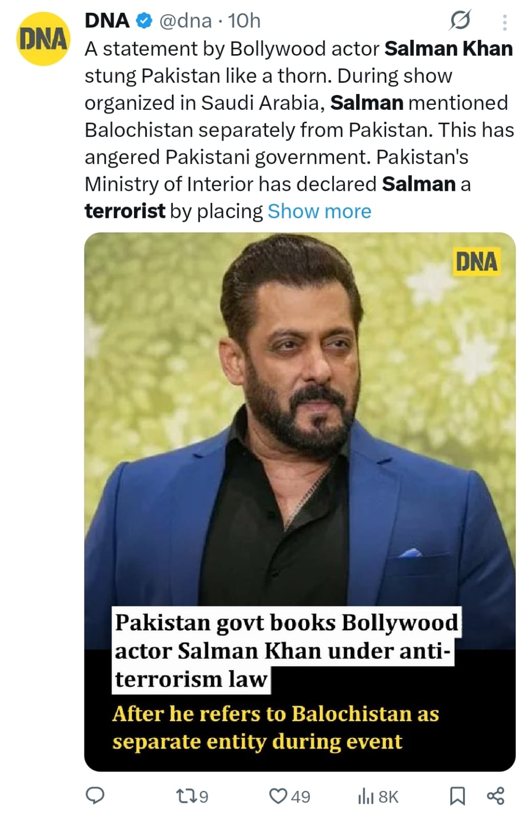 DNA India shared a post saying, “Pakistan govt books Bollywood actor Salman Khan under anti terrorism law after he refers to Balochistan as a separate entity during an event.” The caption adds, “A statement made by Bollywood actor Salman Khan has stung Pakistan like a thorn… Pakistan’s Ministry of Interior had declared Salman a terrorist.”