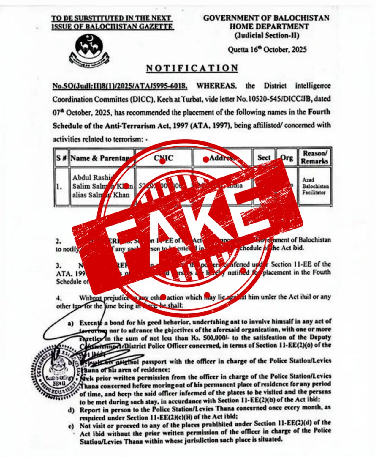 Many reports and social media users also shared a notification allegedly from the Balochistan Home Department dated Oct 16, 2025, that supposedly states that Salman Khan’s name has been placed in the Fourth Schedule of the Anti Terrorism Act, 1997 (ATA, 1997), for activities related to terrorism, and labels him as an ‘Azad Balochistan facilitator’.