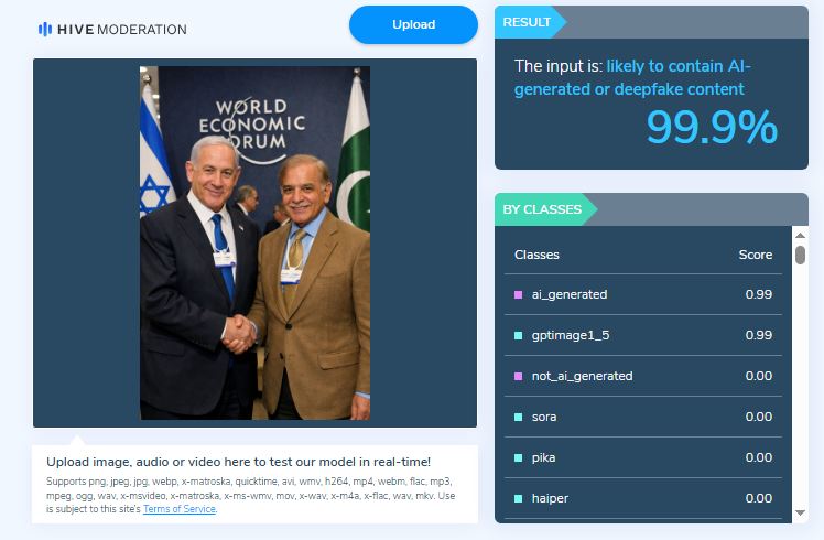 Fact Pakistan used AI content detection softwares that confirmed that the image has been generated. Hive Moderation, an AI detection tool, said the picture is “99.9% likely to contain AI-generated or deepfake content.”
