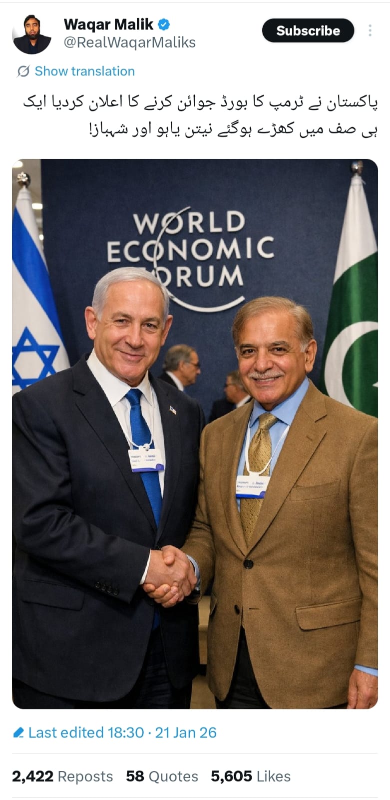 A social media user, Waqar Malik, posted the picture on X, saying, “Pakistan has announced it will join Trump’s board. Netanyahu and Shehbaz stood in the same row!”