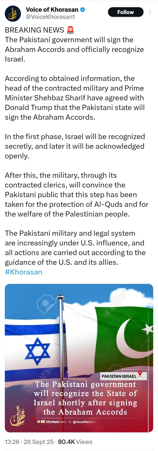 A post by Voice of Khorasan, an Afghanistan based outlet dated September 28, says, “The Pakistani government will sign the Abraham Accords and officially recognize Israel.