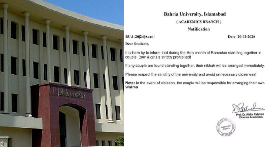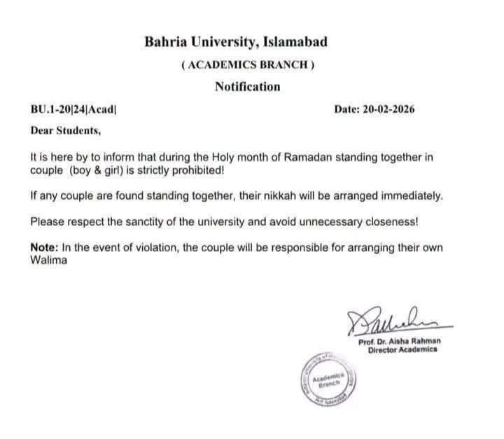 A notification from Bahria University, Islamabad dated Feb 20, 2026, states, “Dear Students, It is here by to inform that during the Holy month of Ramadan standing together in couple (boy & girl) is strictly prohibited!