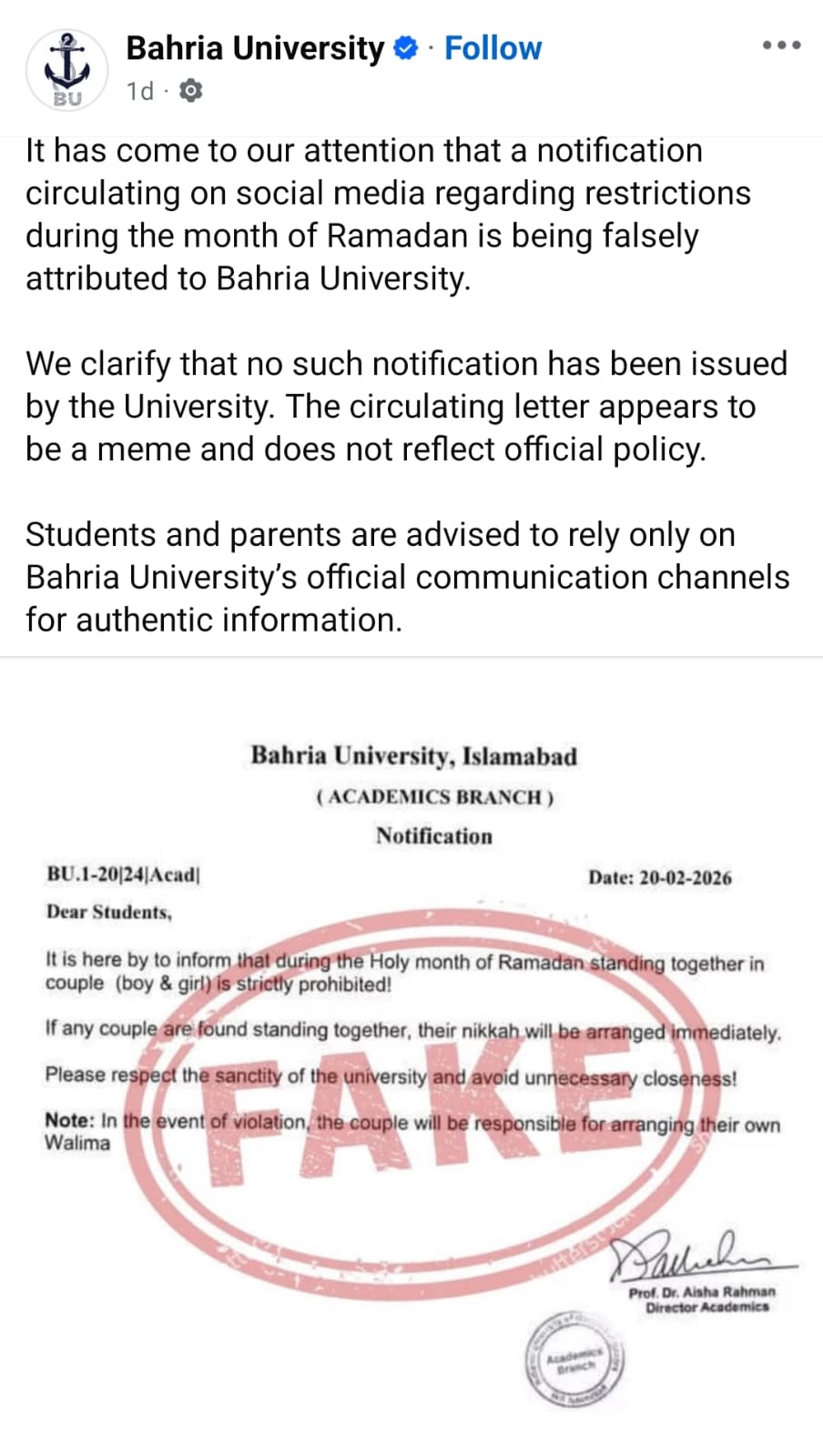 “In a post on the university official Facebook page, Bahria University said, “It has come to our attention that a notification circulating on social media regarding restrictions during the month of Ramadan is being falsely attributed to Bahria University.