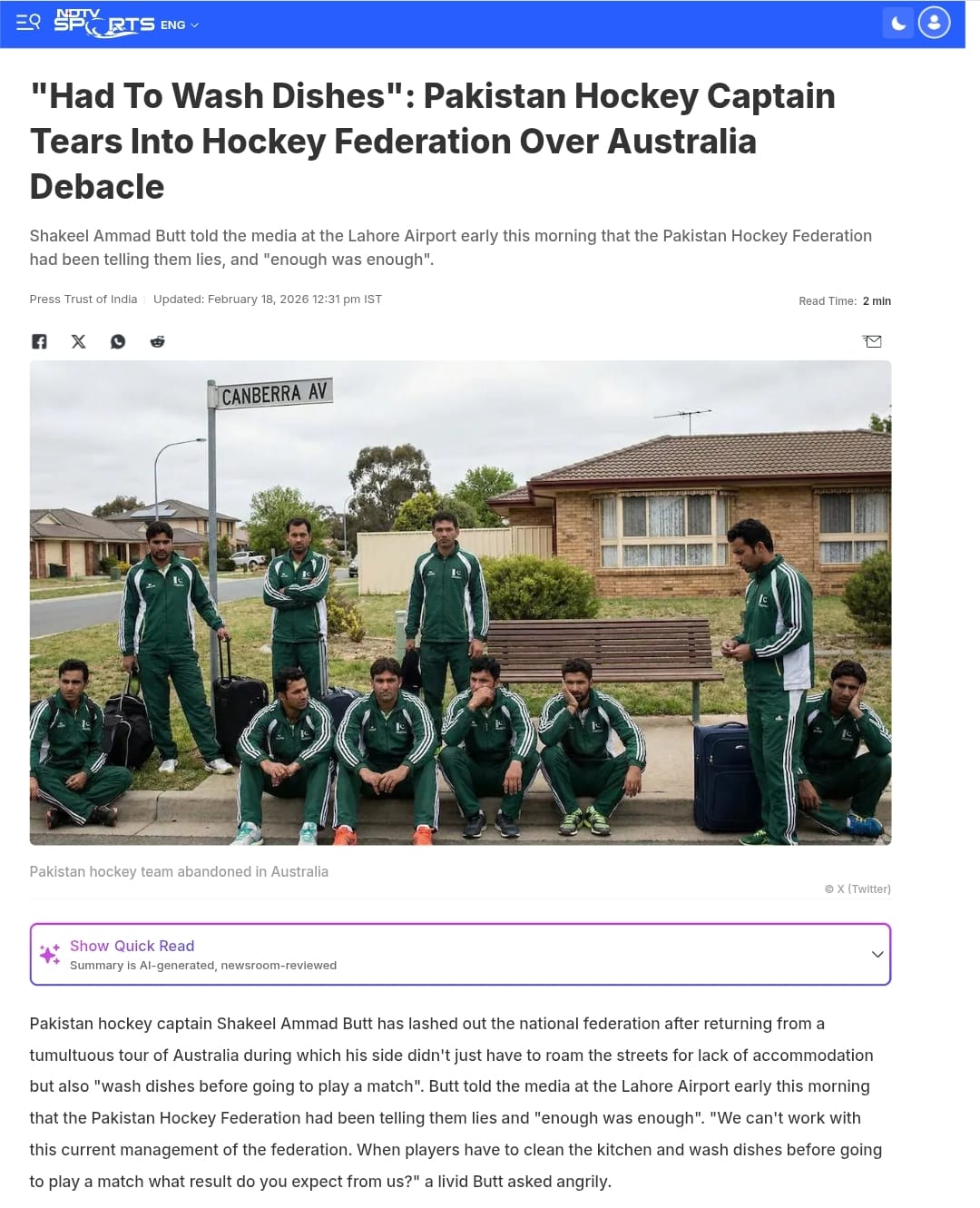 Indian media outlet, NDTV, also used the pic for their news report on Feb 18 titled, “”Had To Wash Dishes”: Pakistan Hockey Captain Tears Into Hockey Federation Over Australia Debacle.”